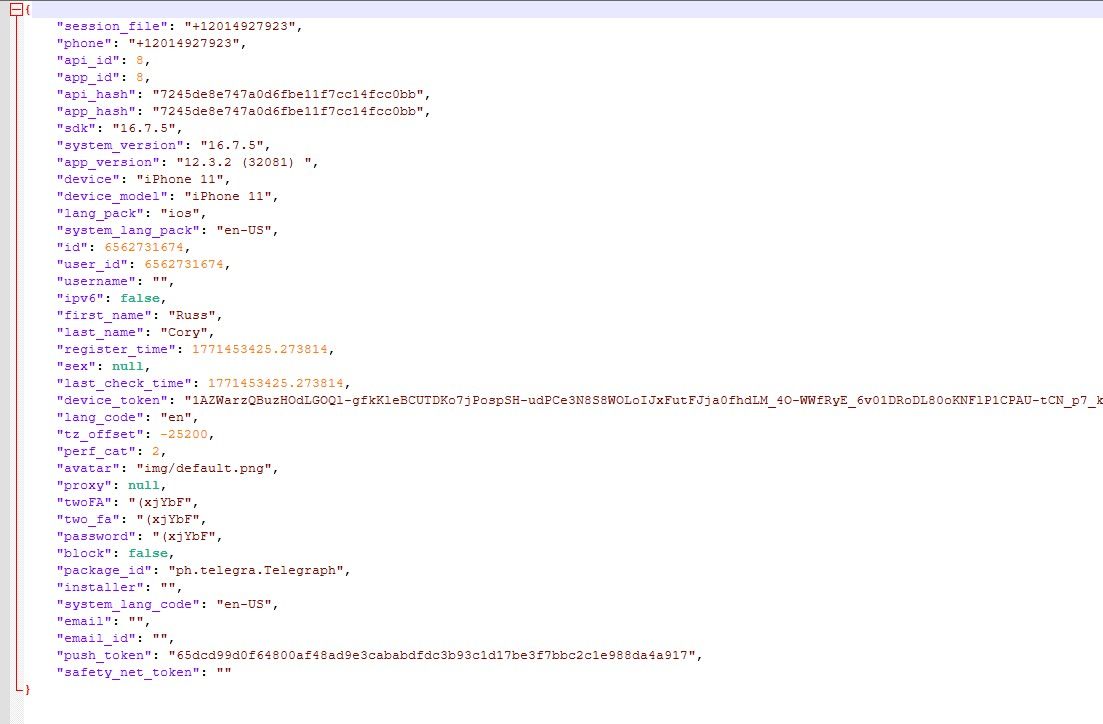 真正成熟的 Telegram 协议实现,必须能够完整复现真实移动端设备的运行参数。我们在导出或配置账号的 JSON 配置文件中,可以看到大量复杂的字段。这些参数并非冗余,而是为了构建一个高拟真的设备指纹 (Device Fingerprint)。二、 为什么简单的脚本逻辑会导致“封号”?
